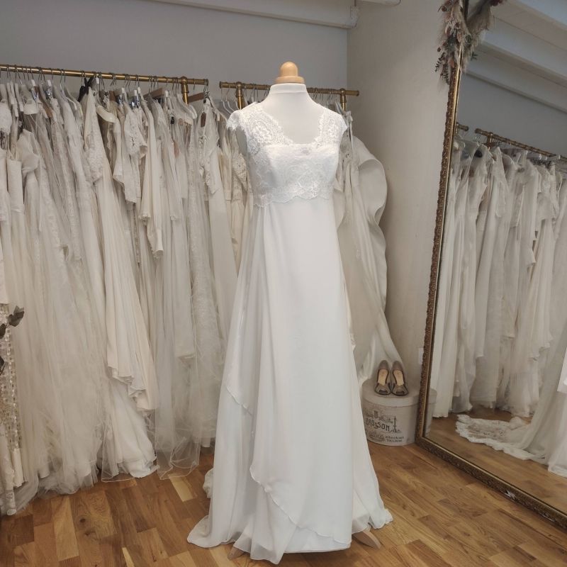 Mon petit mot : La taille haute allonge la silhouette et convient à de nombreuse morphologies ! Il devient plus rare aujourd’hui d’avoir de modèles avec une taille très haute comme celle-ci. Pourtant ce type de coupe affine la silhouette et permet d’oublier nos petites rondeurs de femme 😉 C’est donc un très joli modèle qui plaira a de nombreuses mariées dans une taille 40-42 ! La robe est impeccable.