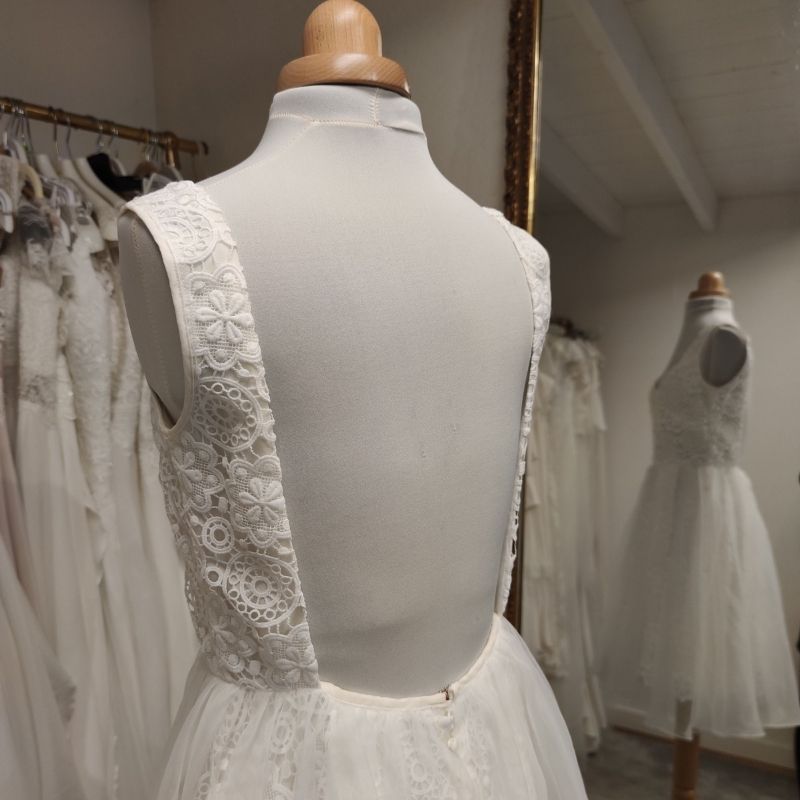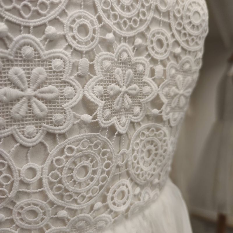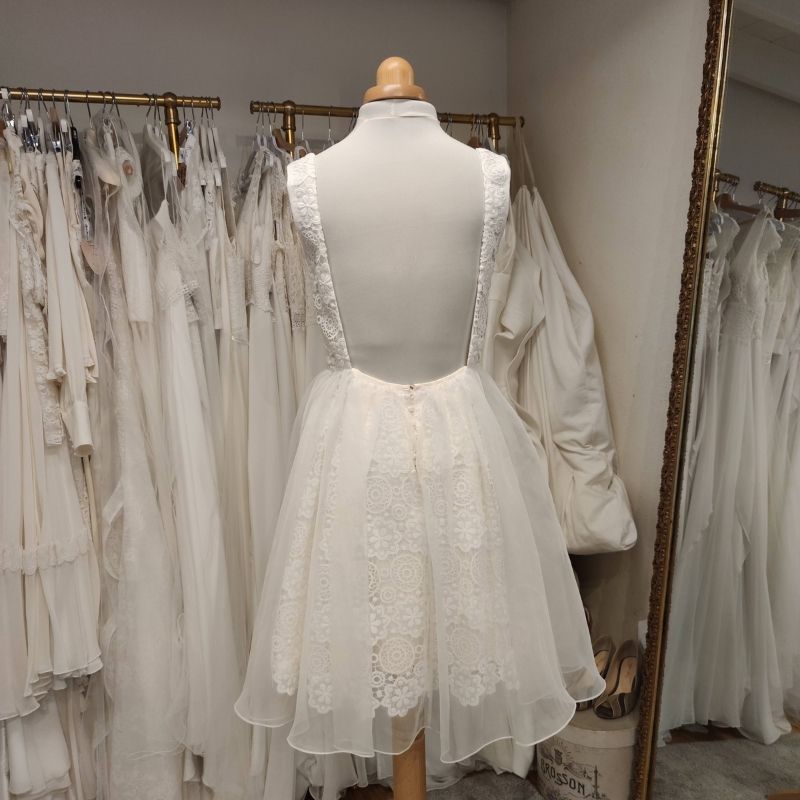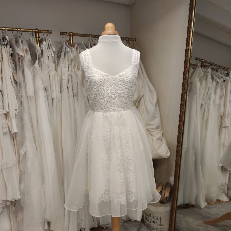 Forme : Robe courte en dentelle de coton et organza - forme patineuse - décolleté et dos en V - bretelle fine - taille marquée - fermeture éclaire invisible