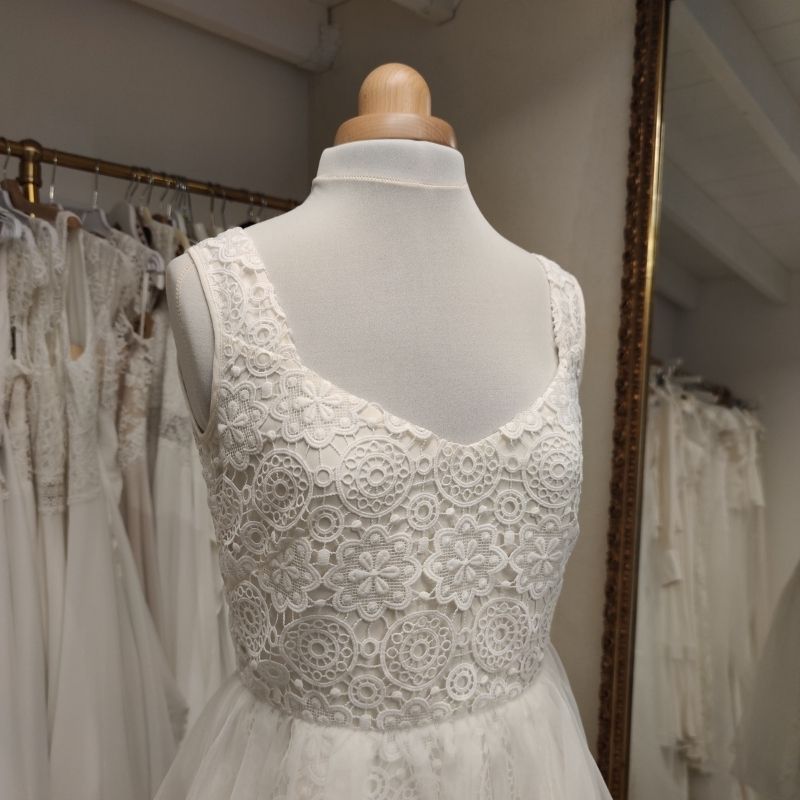 Originale, cette robe de mariée de la collection civile est ravissante. Elle est raffinée avec sa dentelle de coton et vaporeuse avec la jupe en organza.