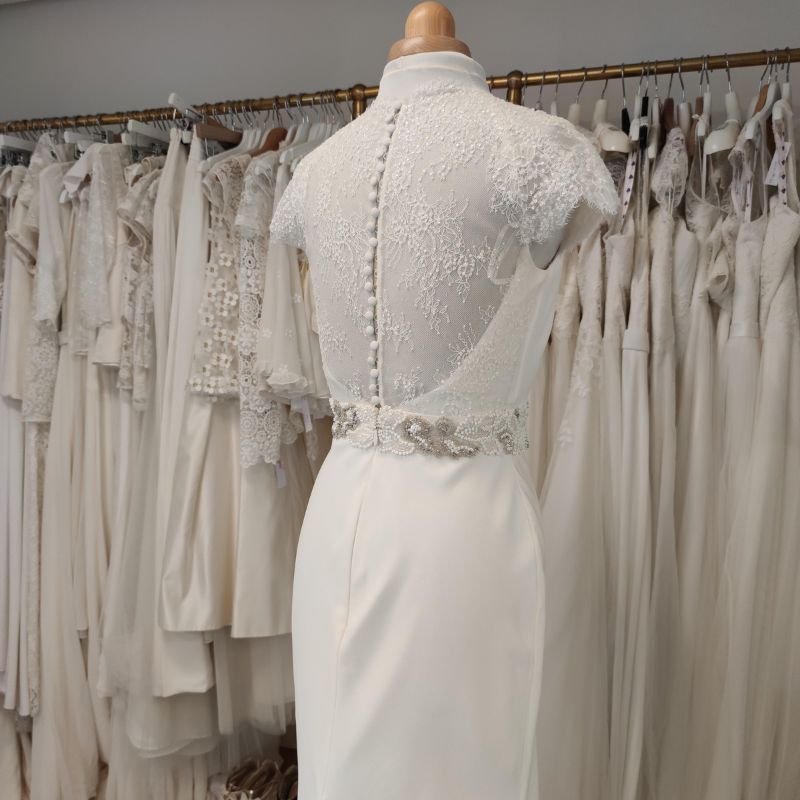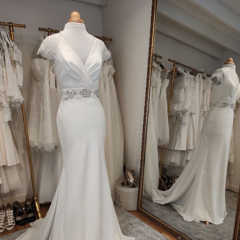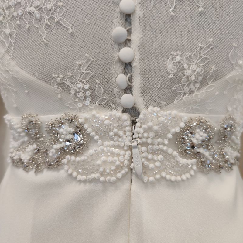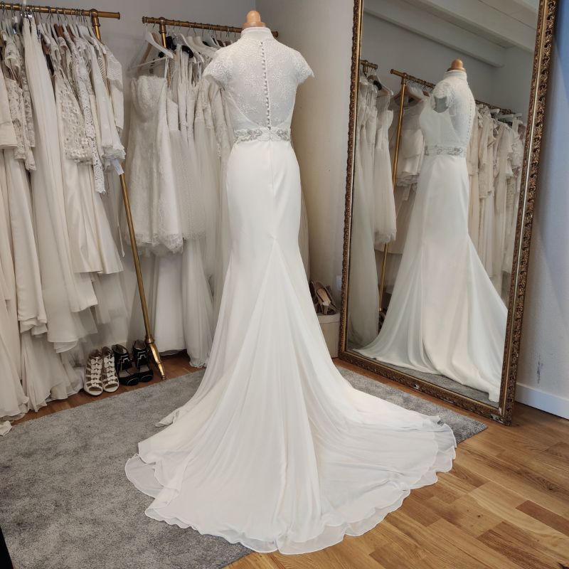 Cette robe peut être facilement modifiable par une couturière : réduction ou suppression d’une partie de la jupe pour une coupe plus droite, suppression de la traine…