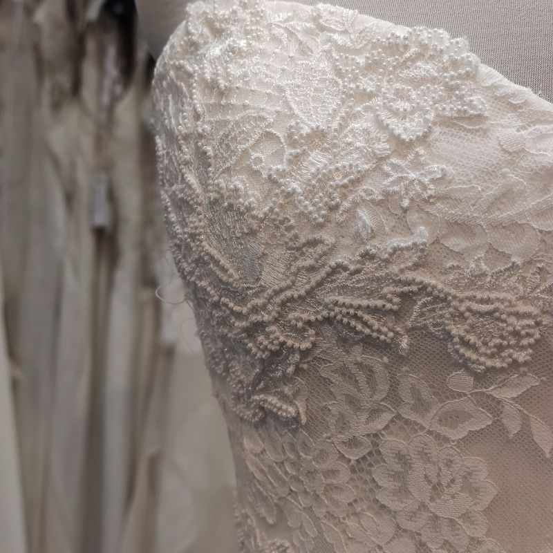 Taille : 44 (ajustement possible +/-) – poitrine : 100B/C – la mariée devra mesurer 1,75m maximum (avec talons)
