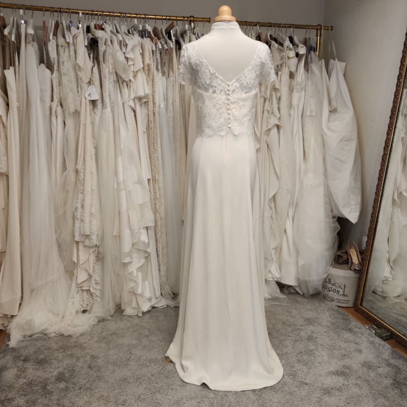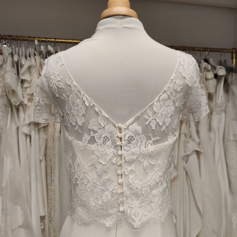 Un ensemble chic pour une mariée élégante en toute simplicité. Le haut en dentelle de calais est délicat et ajoute LA touche de raffinement. Agréable et lumineuse, cet ensemble plaira aux mariées fan de belles matières et de sobriété.