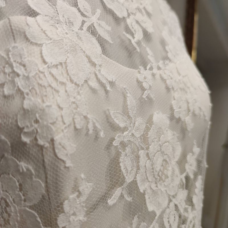 - 1 haut en dentelle de calais fleurie transparent, décolleté en rond et dos en V avec boutonnière
