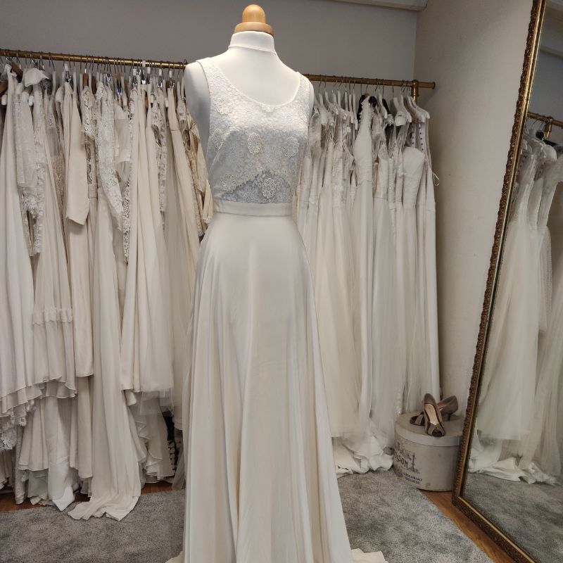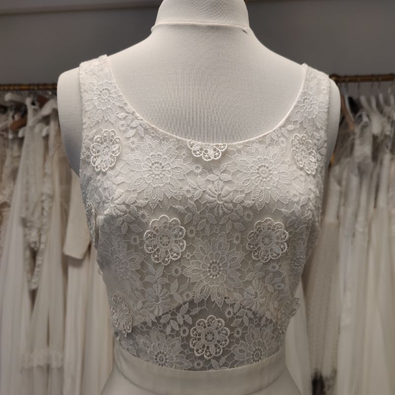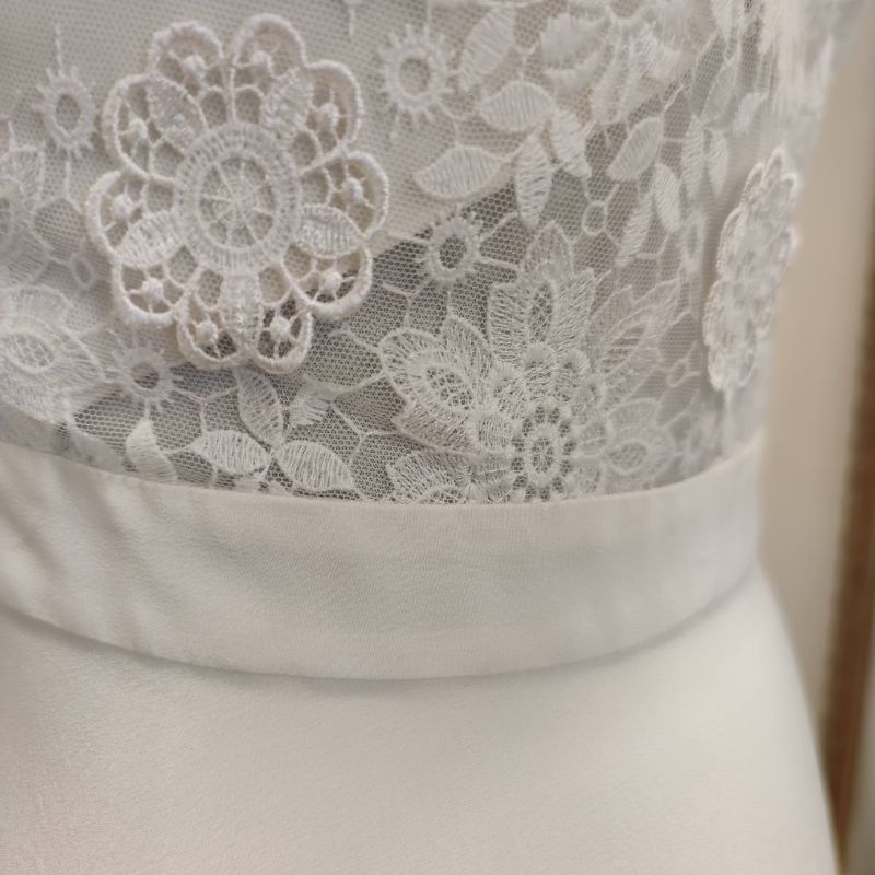 haut en dentelle fleurie, décolleté en rond avec transparence sur le devant de la taille, dos nu à bretelle, jupe fluide en mousseline de soie fermée par une boutonnière, taille marquée et bas du dos échancré