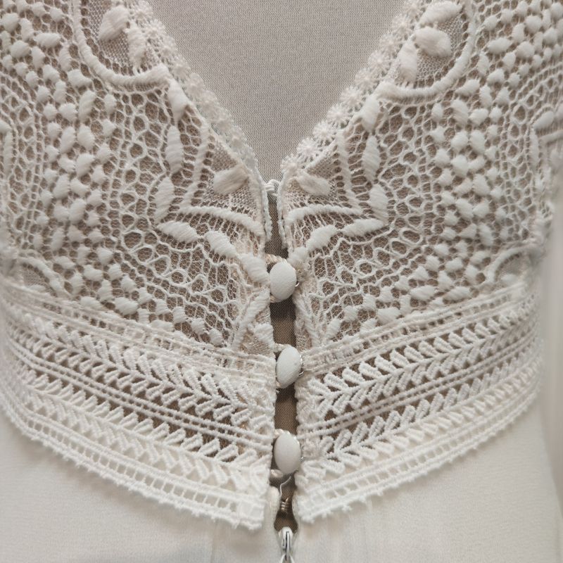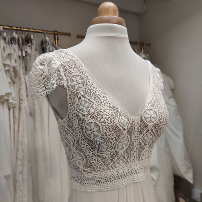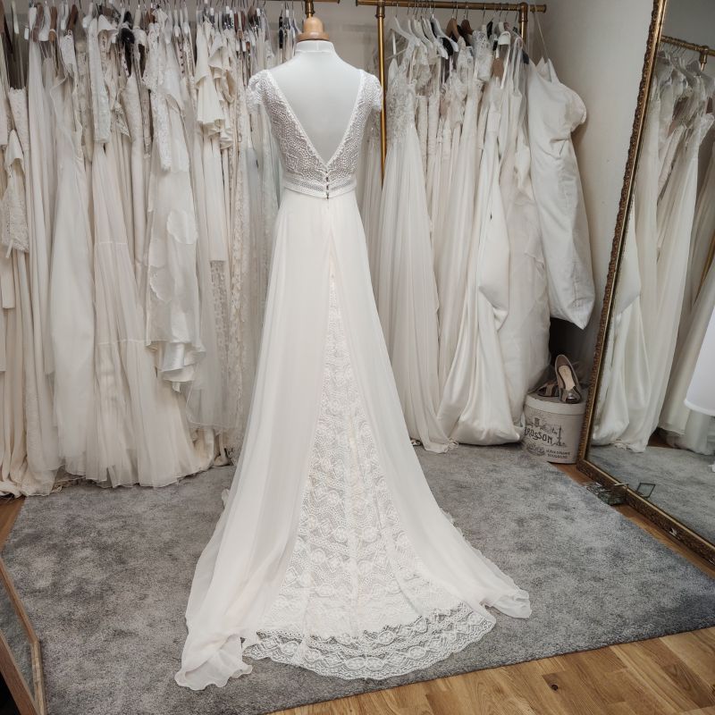 Taille : 34 (ajustement possible +/-) – poitrine : 80A la mariée devra mesurer 1,71 m maximum (avec talons)