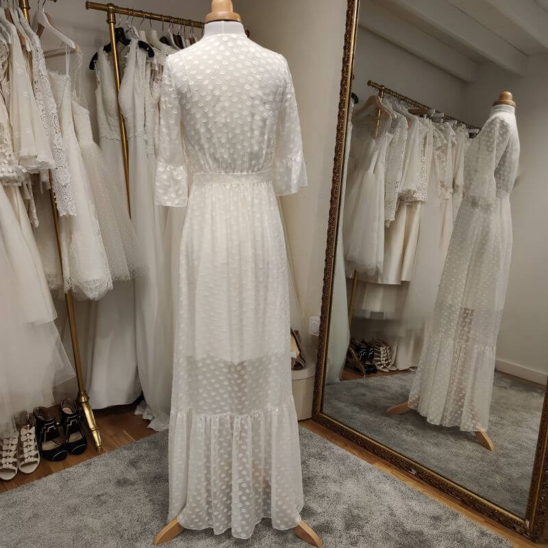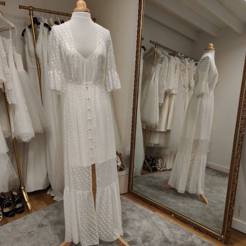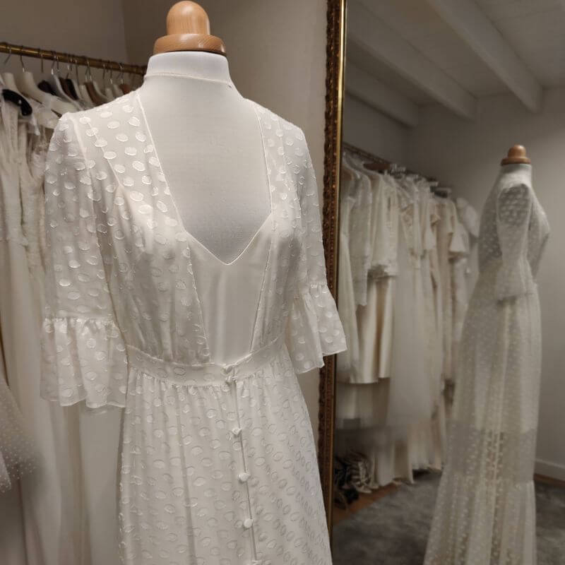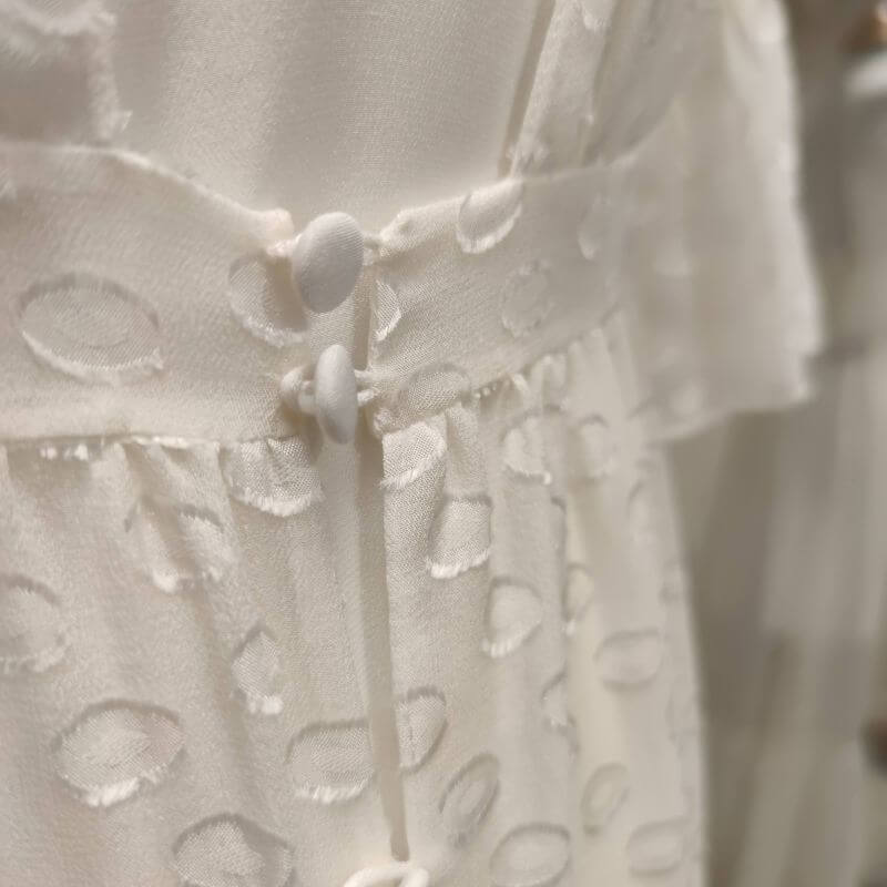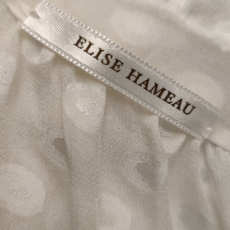 Les robes d’Elise Hameau sont créées dans les plus beaux tissus fabriqués en France : dentelles de Calais et de Caudry, satin, mousselines et soies légères lyonnaises, crêpe georgette, organza, plumetis de soie. Les robes ont été conçues à la main dans l’atelier Parisien de la créatrice.