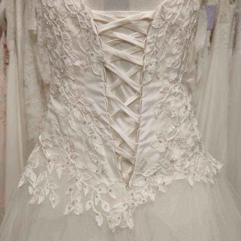 Cette belle robe de mariée princesse vous fera une taille de rêve grâce à son laçage. Le decoletté et le dos en V sont gracieux avec l’effet tatouage de la dentelle ajourée.