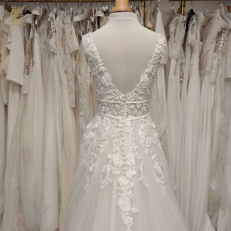 La robe de mariée “Rosa” de la marque Morilee est entre la robe bohème et la robe princesse. Le haut est structuré avec sa ceinture marquée à taille et le décolleté en V plongeant que l’on retrouve sur le dos. Le bas de la robe joue le contraste avec plus de volume. Un équilibre parfait qui donne à cette robe toute son élégance.