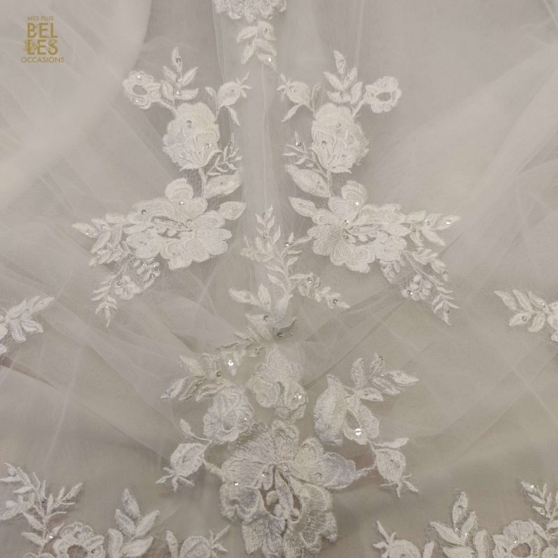 Forme : coupe trapèze - Décolleté et dos en V - applique de dentelle en cascade sur le bas de la robe en tulle- fermeture par glissière
