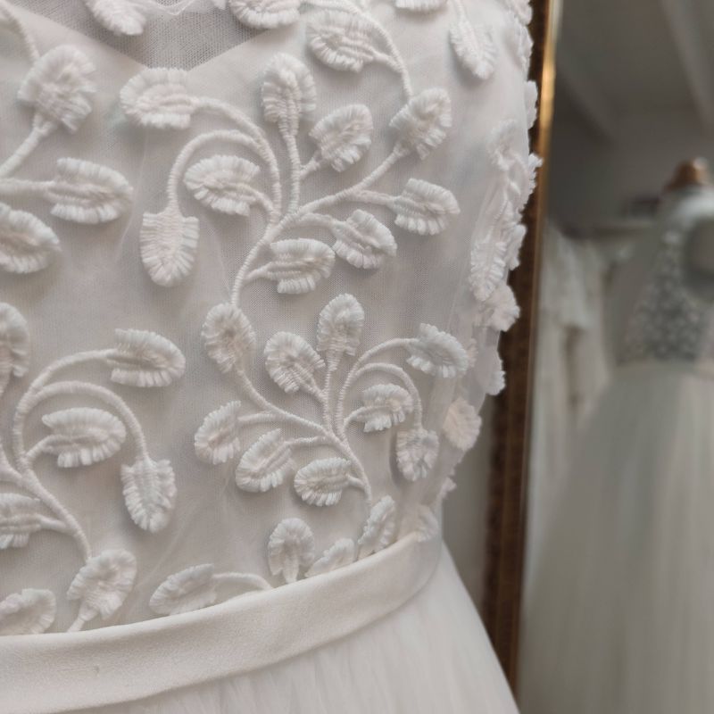 Forme : Robe Fluide - Style Romantique - haut en organza avec broderies florales - décolleté et dos en v - sans manches - taille haute cintrée - ceinture satin - bas de la robe en tulle - fermeture par glissière - pas de traine