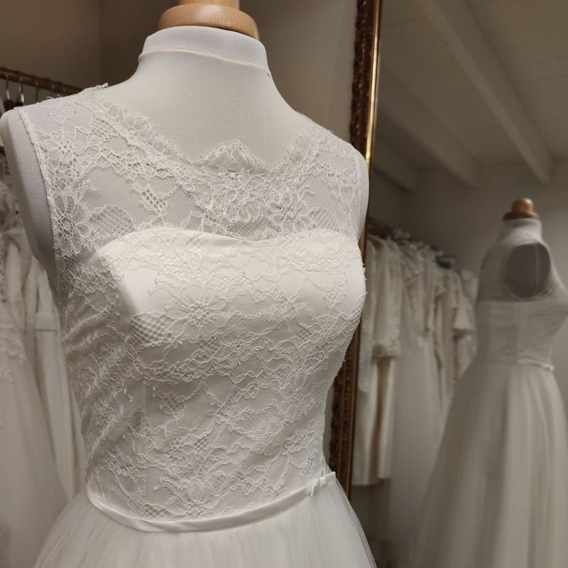  Robe de mariée forme droite - col rond en dentelle fine et forme bustier demi coeur - sans manches - dos en dentelle et boutonnière - taille cintrée - bas de robe en tulle souple doublée