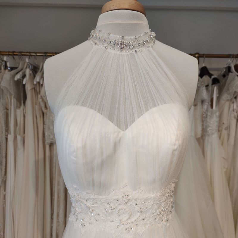 Une robe toute en délicatesse et qui met en avant les épaules. Le drapé de tulle et le tour du cou ornée de cristaux et de perles sont très raffinés et font de cette robe un modèle hyper féminin.