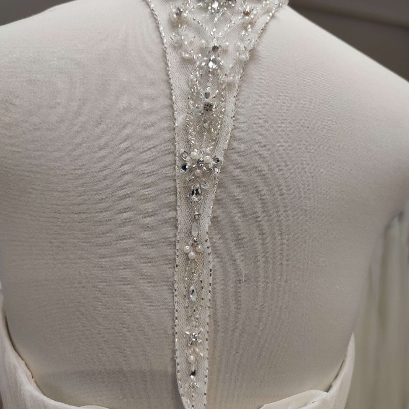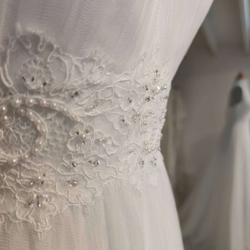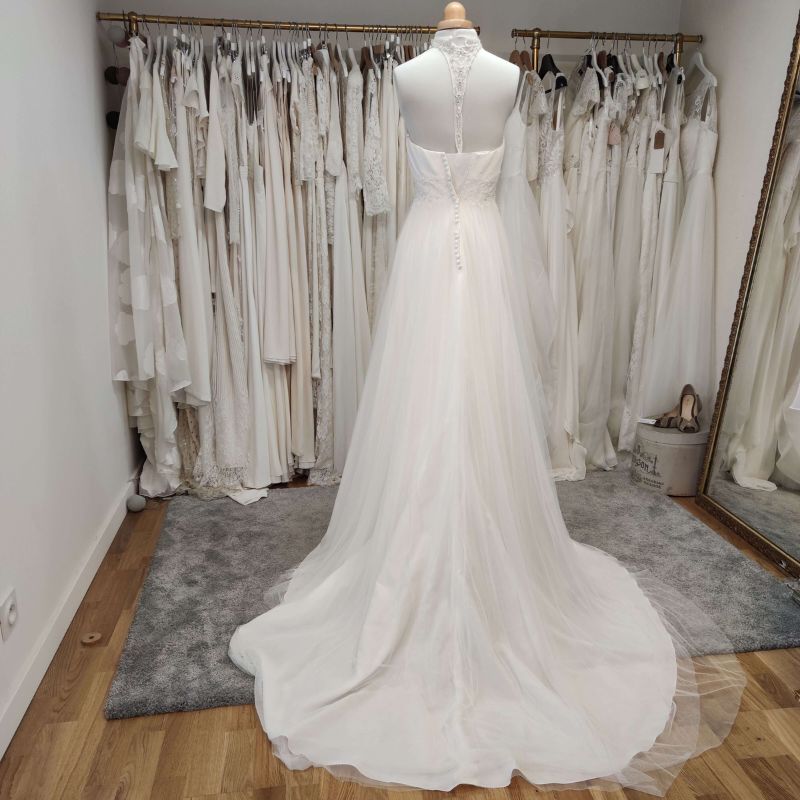 Taille : 34 (ajustement possible +/-) la taille est très fine – la mariée devra mesurer 1,76 m maximum (avec talons)